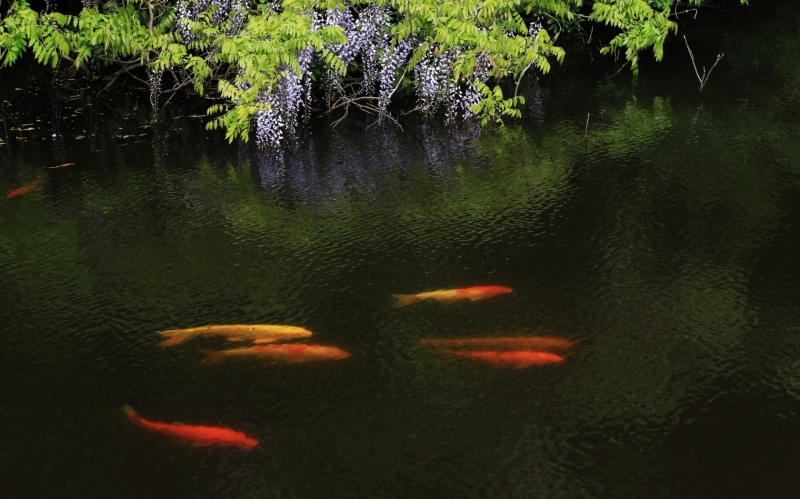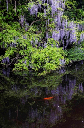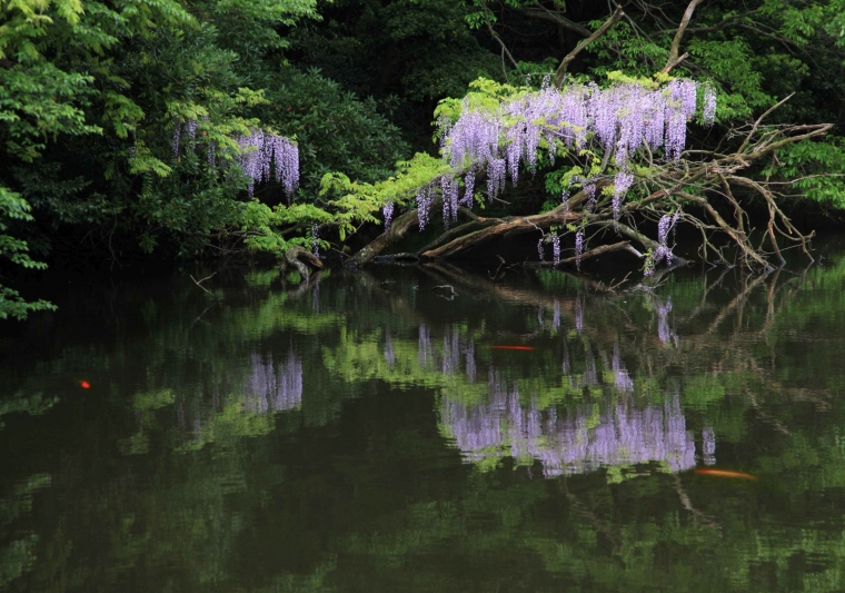 境内の池に垂れ下がる藤は水面に映り込み、幻想的な景色が見られます。