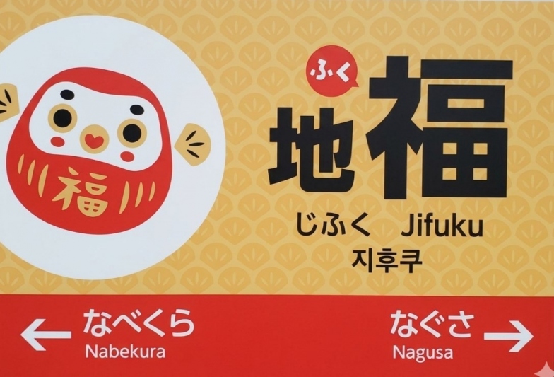 また現在、JR西日本では10月から始まる「デスティネーションキャンペーン」のプレイベントとして、福だるまをあしらった特別な駅名標も登場しています。